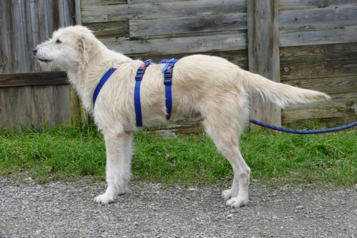 An Leine und Brustgeschirr zu laufen bereitet ihm keinerlei Schwierigkeiten, auch bei Hundebegegnungen ist der hübsche Rüde größenteils verträglich.